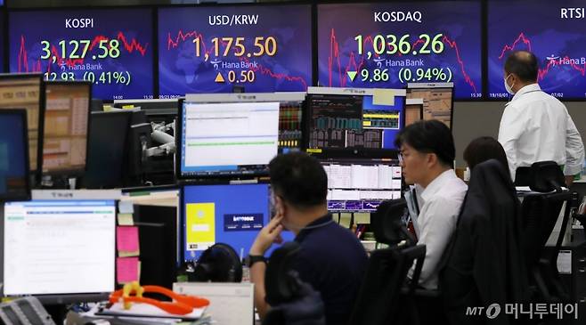 코스피가 전 거래일 대비 12.93포인트(0.41%) 내린 3127.58로 하락, 코스닥이 9.86포인트(0.94%) 내린 1036.26으로 하락, 원·달러 환율은 0.5원 오른 1175.5원으로 마감한 23일 오후 서울 중구 하나은행 딜링룸 전광판에 지수가 표시돼 있다.
