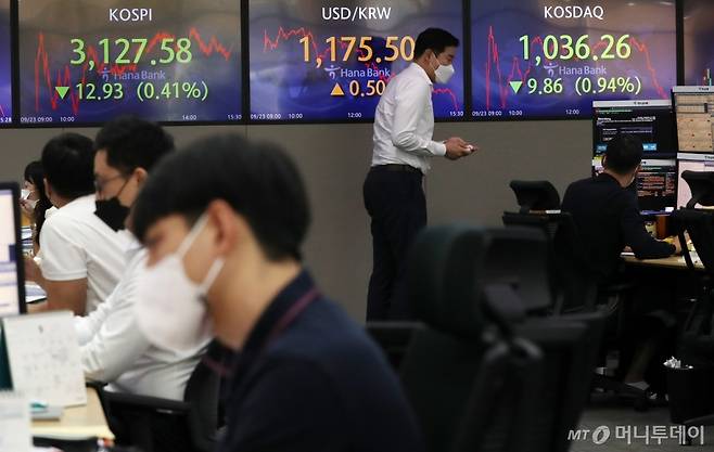 코스피가 전 거래일 대비 12.93포인트(0.41%) 내린 3127.58로 하락, 코스닥이 9.86포인트(0.94%) 내린 1036.26으로 하락, 원·달러 환율은 0.5원 오른 1175.5원으로 마감한 23일 오후 서울 중구 하나은행 딜링룸 전광판에 지수가 표시돼 있다.