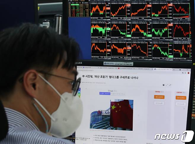 (서울=뉴스1) 송원영 기자 = 23일 오후 서울 중구 하나은행 딜링룸에서 딜러가 중국 부동산 개발회사 헝다그룹 리스크 관련 뉴스를 모니터에 띄워놓고 있다. 이날 코스피 지수는 전 거래일 대비 12.93포인트(0.41%) 내린 3127.58에 거래를 마쳤다. 2021.9.23/뉴스1