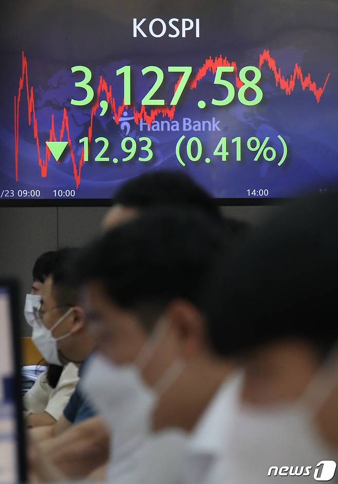 (서울=뉴스1) 송원영 기자 = 23일 오후 서울 중구 하나은행 딜링룸 전광판에 코스피 지수가 전 거래일보다 12.93 포인트(0.41%) 하락한 3127.58을 나타내고 있다. 이날 코스닥지수는 전일 대비 9.85포인트(0.94%) 내린 1036.27로 마감했다. 원달러 환율은 전날보다 0.5원 오른 1175.5원에 거래를 마감했다. 2021.9.23/뉴스1