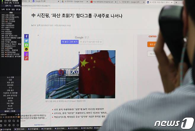 (서울=뉴스1) 송원영 기자 = 23일 오후 서울 중구 하나은행 딜링룸에서 딜러가 중국 부동산 개발회사 헝다그룹 리스크 관련 뉴스를 모니터에 띄워놓고 있다. 이날 코스피 지수는 전 거래일 대비 12.93포인트(0.41%) 내린 3127.58에 거래를 마쳤다. 2021.9.23/뉴스1