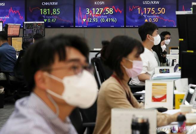 코스피가 전 거래일 대비 12.93포인트(0.41%) 내린 3127.58로 하락, 코스닥이 9.86포인트(0.94%) 내린 1036.26으로 하락, 원·달러 환율은 0.5원 오른 1175.5원으로 마감한 23일 오후 서울 중구 하나은행 딜링룸 전광판에 지수가 표시돼 있다.