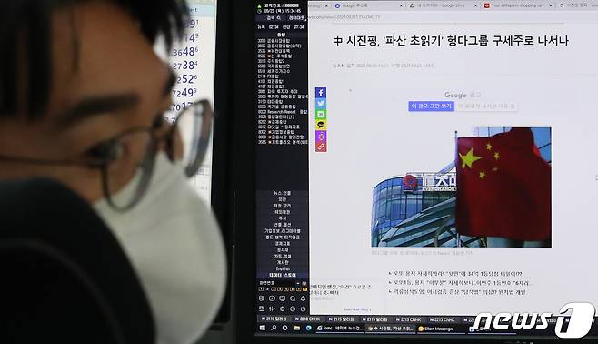 (서울=뉴스1) 송원영 기자 = 23일 오후 서울 중구 하나은행 딜링룸에서 딜러가 중국 부동산 개발회사 헝다그룹 리스크 관련 뉴스를 모니터에 띄워놓고 있다. 이날 코스피 지수는 전 거래일 대비 12.93포인트(0.41%) 내린 3127.58에 거래를 마쳤다. 2021.9.23/뉴스1