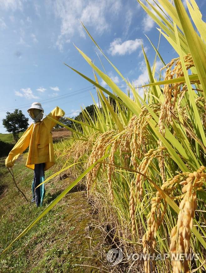 (진안=연합뉴스) 최영수 기자 = 추분인 23일 전북 진안군 상전면 논에서 허수아비가 황금빛으로 익어가는 벼를 지키고 있다. 2021.9.23