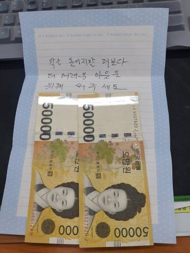 익명의 주민은 "추석을 맞아 어려운 이웃에게 따뜻한 마음을 전달하고 싶다"며 "리어카를 몰고 폐지를 주어 조금씩 모은 돈이고 본인도 몸이 불편한 장애를 지니고 있어 넉넉한 형편은 아니지만 어려운 이웃과 나눌 수 있어 행복하다"고 말했다.