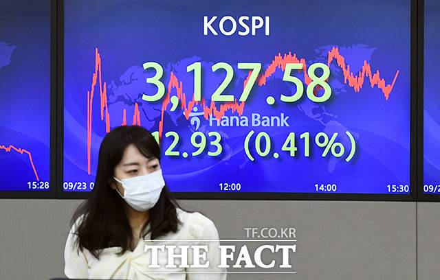 [더팩트ㅣ이동률 기자] 중국 헝다그룹의 파산 위기가 제기된 26일 오후 서울 중구 하나은행 명동점 딜링룸 전광판에 코스피 지수가 전날보다 하락한 3127.58로 나타나고 있다.