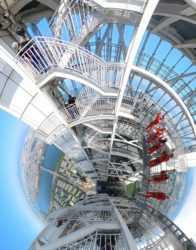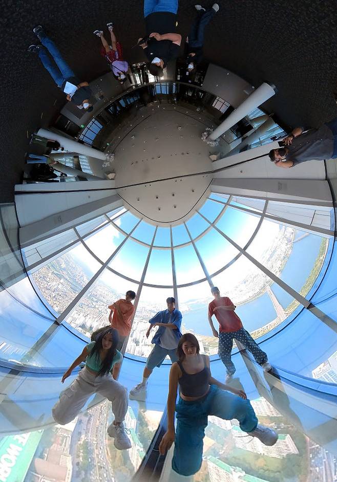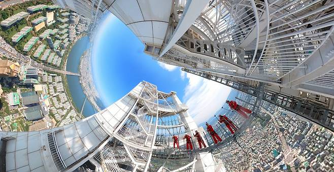 관광 명소를 가상현실(VR)·증강현실(AR) 기술을 통칭하는 확장현실(XR) 기술을 접목해서 360도 입체 영상으로 만든 '랜선 투어' 콘텐츠가 인기를 끌고 있다. 23일 아바엔터테인먼트 제작진이 롯데월드타워 스카이브릿지에서 360도 영상콘텐츠를 제작하고 있다.