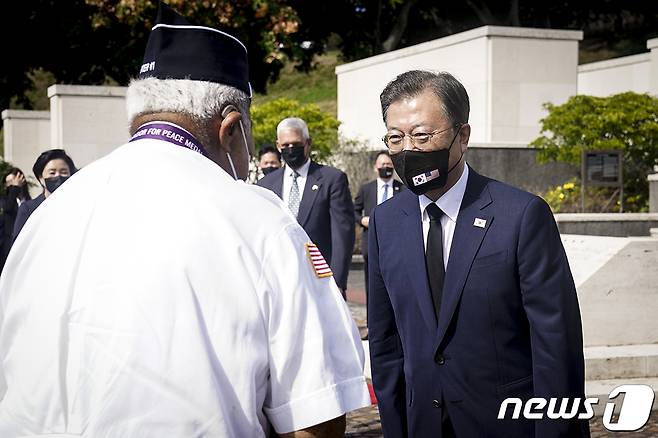 (서울=뉴스1) = 문재인 대통령이 22일(현지시각) 미국 하와이 펀치볼 국립묘지를 방문해 한국전 참전용사와 인사나누고 있다.(청와대 제공)2021.9.23/뉴스1