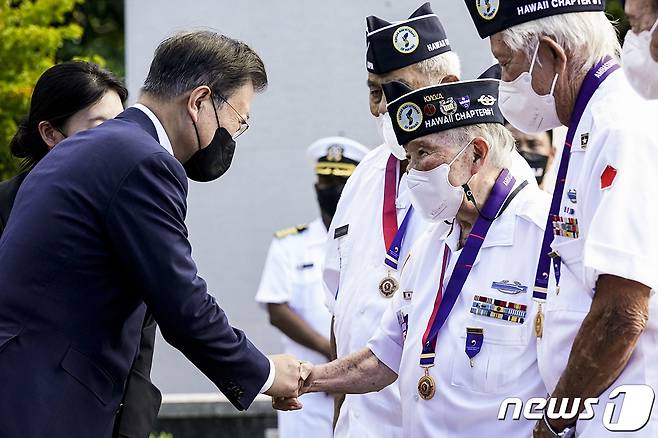 (서울=뉴스1) = 문재인 대통령이 22일(현지시각) 미국 하와이 펀치볼 국립묘지를 방문해 한국전 참전용사들과 인사나누고 있다.(청와대 제공)2021.9.23/뉴스1