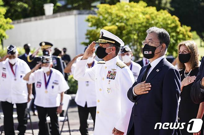 (서울=뉴스1) = 문재인 대통령이 22일(현지시각) 미국 하와이 펀치볼 국립묘지에서 참배하고 있다.(청와대 제공)2021.9.23/뉴스1