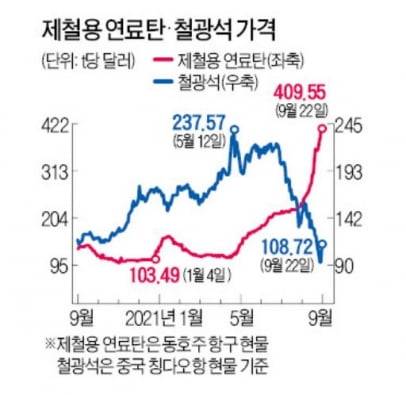 철광석 '급락' vs 석탄 '역대 최고가 경신'에 산업계 '아리송'