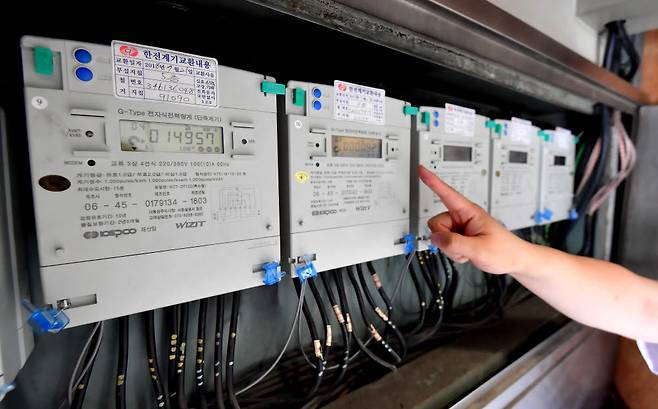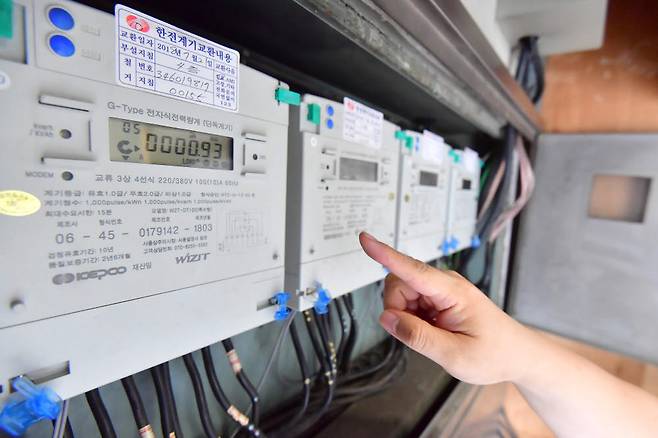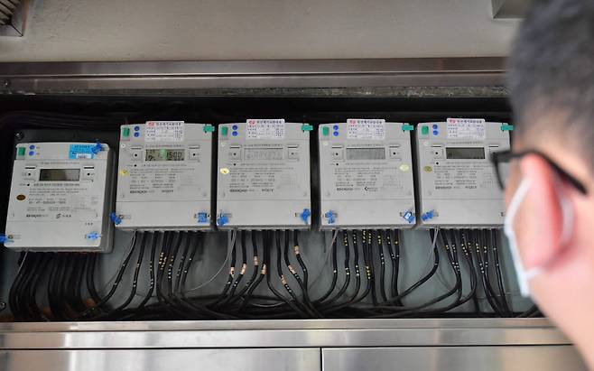 한전이 8년 만에 전기요금을 kwh당 3원 인상했다. 23일 한국전력공사는 홈페이지를 통해 이런 내용을 담은 2021년 10∼12월분 연료비 조정 단가 산정 내역을 발표했다. 이날 서울 영등포구 한 회사에 설치된 전력계량기가 돌아가고 있다.