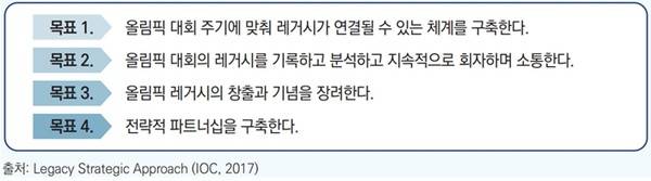 올림픽 레거시 범주의 설정과 과정의 체계화 역시, 남아있는 우리에게 그리고 우리의 후손에게 올림픽을 활용한 우리의 결정이 얼마나 긍정적인 영향을 미칠 것인가를 명확히 설명하기 위해서라고 할 수 있다. 결국 살아있는 자들의 욕망과 꿈, 그리고 미래를 위한 선물이 올림픽이라는 포장지에 둘러싸인 것이 올림픽 레거시라 할 수 있다. 이러한 관점은 국제올림픽위원회가 제시한 전략적 레거시 창출의 지침을 통해서도 드러난다. 어쩌면 계량화하기 어려운 유·무형의 레거시를 보다 폭넓게 규정하기 위함이기도 하지만, 또 다른 측면에서는 레거시를 우리 삶에 깊숙이 뿌리내리고자 하는 섬세하고 치밀한 계획으로 볼 수 있다. 레거시 창출 전략은 다음의 네 가지로 구성된다.
