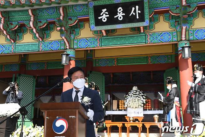 (서울=뉴스1) = 김현모 문화재청장이 23일 오후 충남 금산군 칠백의총에서 열린 제429주년 칠백의사 순의제향에서 인사말을 하고 있다.