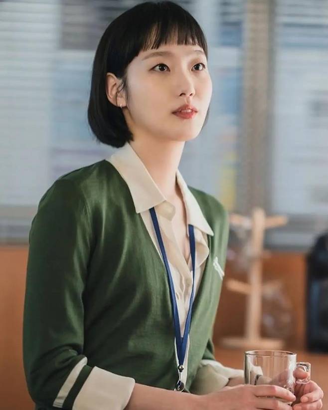 유미 패션의 포인트는 과하지 않고 깔끔하다는 것. 김고은은 얇은 니트 가디건을 셔츠와 함께 매치해 단정한 룩을 완성했다. 브이넥 카디건에 이너로 셔츠를 매치하면 단정한 오피스룩으로 좋을 듯!