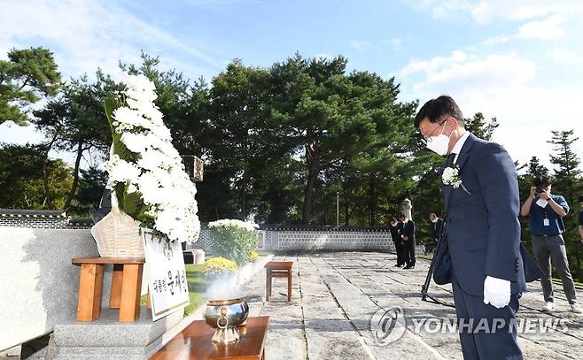 (서울=연합뉴스) 김현모 문화재청장이 23일 오후 충남 금산군에 있는 칠백의총에서 열린 '제429주년 칠백의사 순의제향'에 참석해 대통령 명의로 헌화한 뒤 묵념하고 있다. 2021.9.23