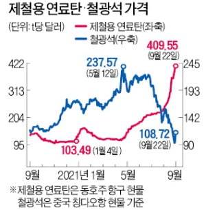 철광석을 녹일 때 쓰이는 제철용 원료탄(석탄) 가격이 연초 대비 세 배가량 치솟으며 13년 만에 역대 최고치를 경신했다. 중국의 감산에 철광석 가격은 2개월 만에 반토막 났다. 원료탄과 철광석 가격의 이례적 ‘디커플링(탈동조화)’ 심화에 철강업계의 시계도 흐릿해지고 있다.