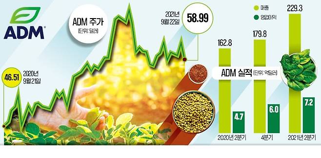곡물 가격 급등세에 ADM의 올해 2분기 매출은 전년 동기 대비 40.8% 늘어난 229억달러를 기록했다. 분기 기준 8년 만의 최대치다. 아프리카돼지열병으로 2억 마리까지 감소했던 중국 돼지 수가 최근 4억 마리 수준으로 회복하며 사료 수요도 크게 늘고 있다.
