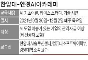 인공지능(AI) 도입을 고민하는 기업 임직원을 대상으로 AI 기초이론과 적용 사례 등을 가르쳐주는 전문 교육 과정이 생긴다. 한양대와 한국경제신문사는 기업의 AI 도입 의사결정을 위한 ‘한양대-한경 AI 아카데미’를 개설한다고 23일 밝혔다.