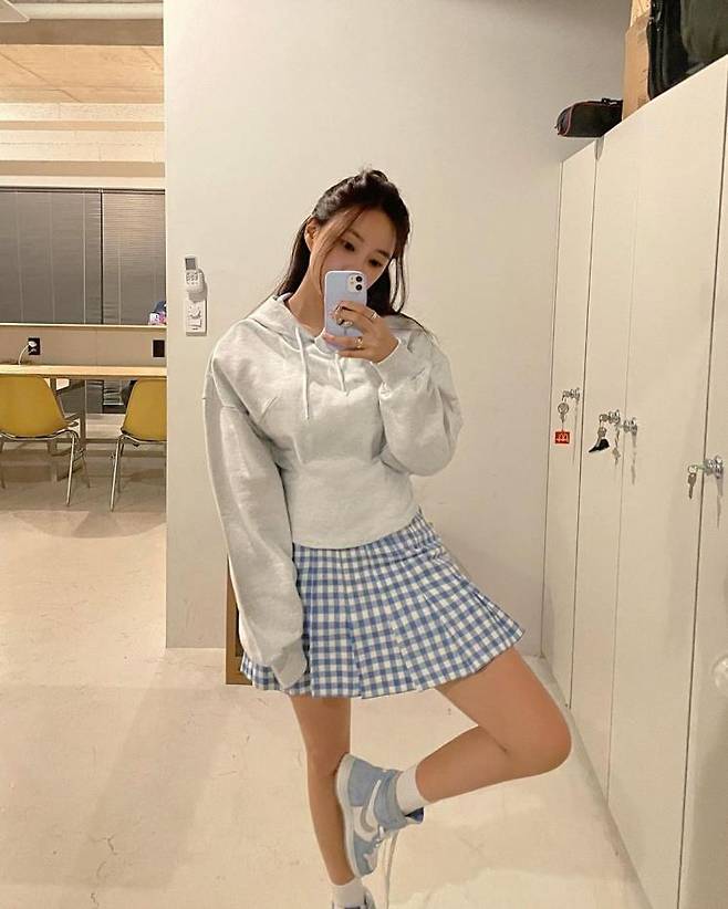 발랄하고 사랑스러운 무드의 ‘블루 체크 미니스커트’에 오버핏 후드, 같은 컬러의 운동화로 포인트를 주어 편안하면서도 캐주얼한 원마일웨어룩을 선보인 효민. 화이트 맨투맨은 어떤 하의와 매치하느냐에 따라 분위기가 천차만별 달라지는데 효민처럼 컬러감 있는 하의를 선택하면 다소 밋밋할 수 있는 패션에 포인트는 물론, 믹스매치 무드를 완성할 수 있다.