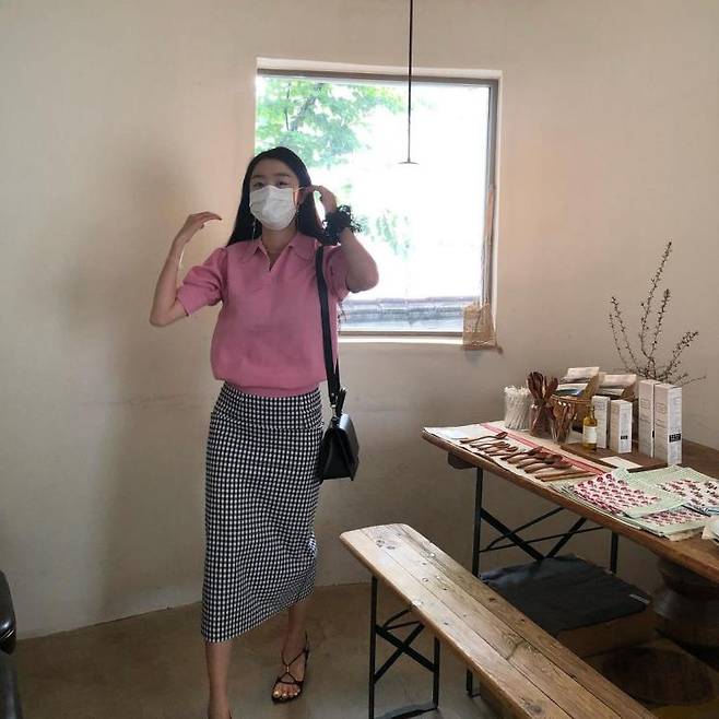 핑크컬러의 퍼프 반팔 니트와 ‘블랙 체크 롱스커트’를 함께 매치한 한선화. 스커트가 길기 때문에 활동하기에 부담이 적어 올 가을 트렌드인 편안함과 잘 어울리는 아이템이다. 한선화처럼 베이직한 느낌의 체크 패턴 롱스커트를 고르고 컬러 포인트가 되는 상의를 매치해도 좋고, 상의는 최대한 심플한 디자인을 매치하고 패턴이 돋보이는 롱스커트로 포인트를 주는 것도 좋다. 이때 슈즈의 컬러를 스커트의 컬러와 통일시킨다면 다리가 더 길어 보이며 안정감 있는 스타일링을 완성할 수 있다.