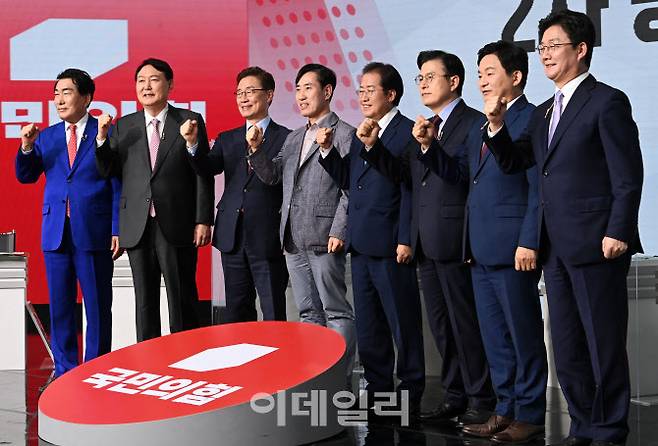 [국회사진취재단] 국민의힘 대선 예비후보들이 23일 오후 서울 강서구 ASSA 스튜디오에서 열린 제20대 대통령후보자 선거 제2차 방송토론회에 앞서 기념촬영을 하고 있다. 왼쪽부터 안상수, 윤석열, 최재형, 하태경, 홍준표, 황교안, 원희룡, 유승민 후보.