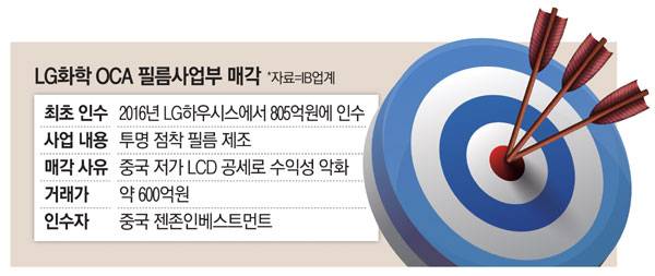 23일 투자은행(IB) 업계에 따르면 LG화학은 OCA 필름 사업부문을 중국 젠존인베스트먼트에 약 600억원에 매각했다. OCA는 터치스크린패널(TSP)의 각 레이어(Layer) 또는 커버글라스와 디스플레이를 붙이기 위해 사용되는 광학적으로 투명한 점착 필름이다. 한 화학업체 관계자는 "쉽게 말하자면 패널 소재를 붙이는 필름 형태 접착제"라며 "노트북컴퓨터, 태블릿 PC, 스마트폰, 자동차용 디스플레이를 완성하는 데 필요하다"고 설명했다.