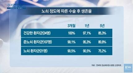 연구팀 분석에 따르면, 수술 뒤 3개월~1년 사이 건강한 환자 그룹의 경우 교통사고 사망 1명 외에 100% 생존율을 보였지만, 준노쇠 그룹에서는 95.3%, 노쇠 그룹은 90.5%까지 그 비율이 떨어졌습니다.