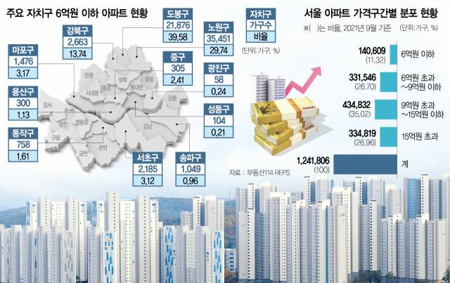 6억 원 이하 아파트 비중이 10%에 미치지 못하는 자치구는 1년 전 9곳에서 현재 15곳으로 늘었다. △강남(3.31%) △강동(1.87%) △광진(0.24%) △동대문(5.28%) △동작(1.61%) △마포 3.17% △서대문(7.67%) △서초(3.12%) △성동(0.21%) △성북(7.66%) △송파(0.96%) △양천(9.33%) △영등포(3.07%) △용산(1.13%) △중구(2.41%) 등이다.