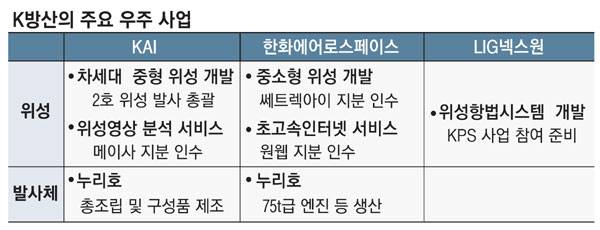 국내 방산업체들의 우주 사업은 크게 위성과 발사체(로켓) 부문으로 구분된다. 업계 '맏형'인 KAI는 내년 상반기에 발사 예정인 차세대 중형 위성 2호의 시스템 설계와 본체 개발, 제작, 조립, 시험, 발사 등을 총괄하고 있다. 최근에는 위성 서비스 시장에도 뛰어들었다. KAI는 이달 초 국내 항공영상 분석업체 '메이사' 지분 20%를 인수했다. 발사체 부문에서는 다음달 20일 발사 예정인 한국형 발사체 '누리호'의 총조립을 맡고 있다.