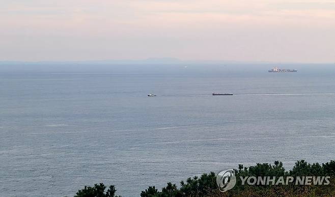 (부산=연합뉴스) 조정호 기자 = 맑은 가을 날씨를 보인 23일 부산 해운대구 달맞이언덕에서 바라본 바다 건너편에 대마도가 보이고 있다. 2021.9.23