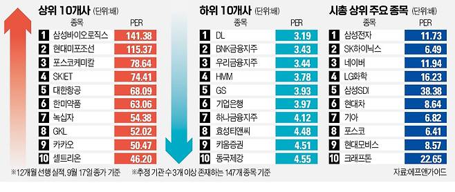 PER이 가장 높은 기업은 삼성바이오로직스(141.38배)와 현대미포조선(115.37배)으로 나타났다. 그다음은 포스코케미칼(78.64배), SK아이이테크놀로지(74.41배), 대한항공(68.09배), 한미약품(63.06배), 녹십자(54.38배) 순이었다.