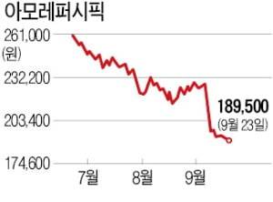 23일 아모레퍼시픽은 0.26% 하락한 18만9500원에 마감했다. 올초 20만3000원 수준이던 아모레퍼시픽 주가는 지난 5월 말 30만원으로 47.78% 올랐다. 중국의 코로나19 확산세가 사그라든 데다 글로벌 경기 회복 기대감이 맞물린 결과였다. 그러나 4개월여 만에 상승분을 모두 반납했다.