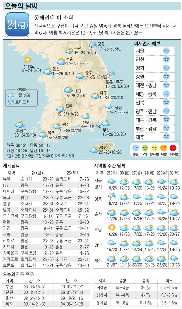 [오늘의 날씨] 24일, 동해안에 비 소식