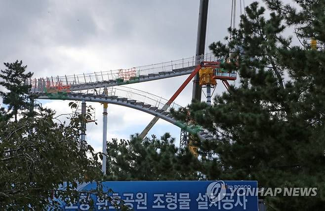 (포항=연합뉴스) 손대성 기자 = 23일 경북 포항시 북구 환호공원에 포스코가 건설 중인 체험형 조형물 '클라우드' 설치 공사가 진행되고 있다. 2021.9.23