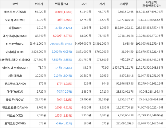 가상화폐 시세 (제공: 암호화폐 거래소 업비트)현재 암호화폐 거래소 "업비트"에 따르면 가상화폐 대장 격인 비트코인의 시세는 전일 대비 -215,000원(-0.4%) 하락한 53,641,000원에 거래되고 있다.