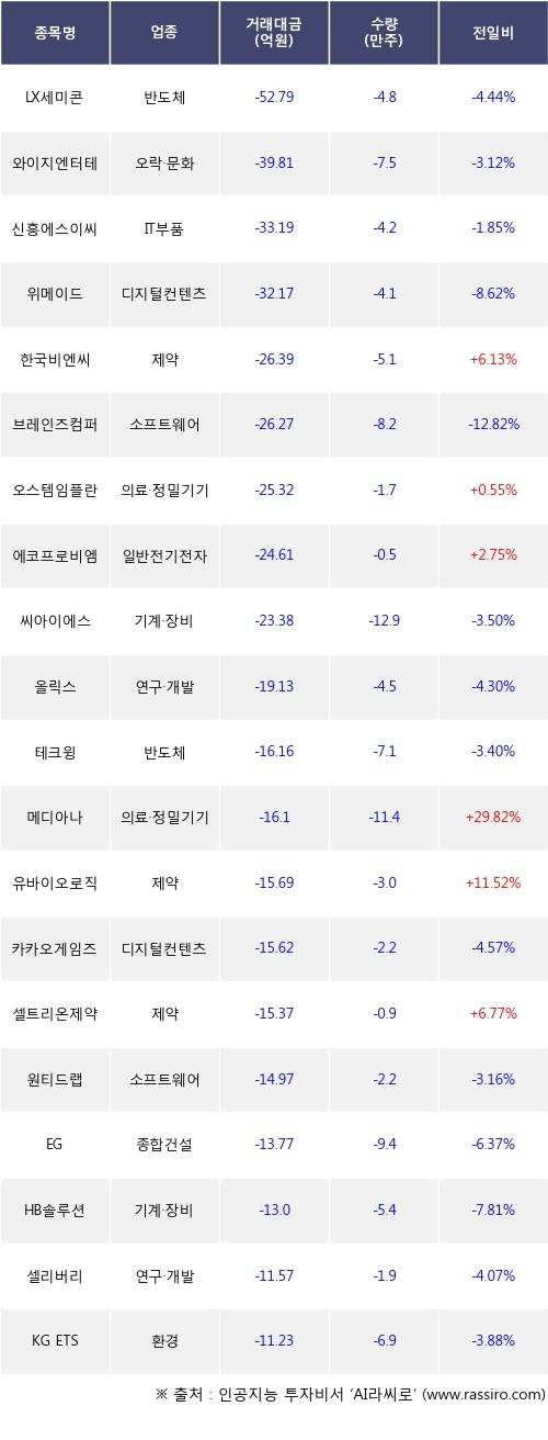 기관 투자자의 순매도 상위 20개 종목은 LX세미콘, 와이지엔터테인먼트, 신흥에스이씨, 위메이드, 한국비엔씨, 브레인즈컴퍼니, 오스템임플란트, 에코프로비엠, 씨아이에스, 올릭스등이다.