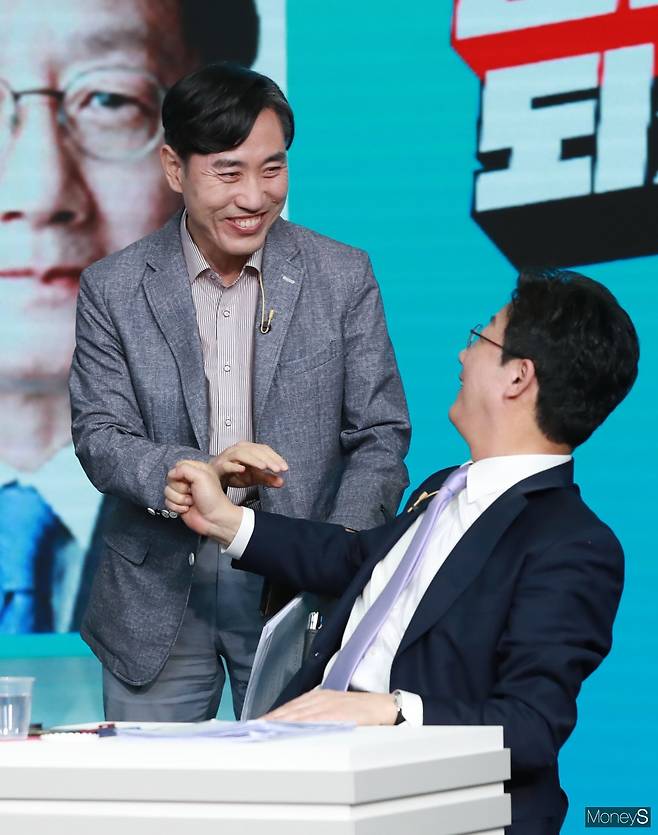 [머니S포토] 2차 토론회 앞서 유승민과 인사하는 하태경