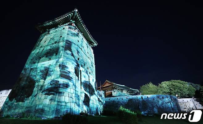 (수원=뉴스1) 김영운 기자 = 2021 수원화성 미디어아트쇼 개막 하루 전인 23일 오후 경기도 수원시 팔달구 수원화성 화서문에서 메인 프로그램인 ‘미디어파사드&라이트쇼’ 리허설을 하고 있다. 2021 수원화성 미디어아트쇼는 오는 24일부터 내달 24일까지 수원화성 화서문 및 생태교통마을, 장안공원 일원에서 즐길 수 있다. 2021.9.23/뉴스1