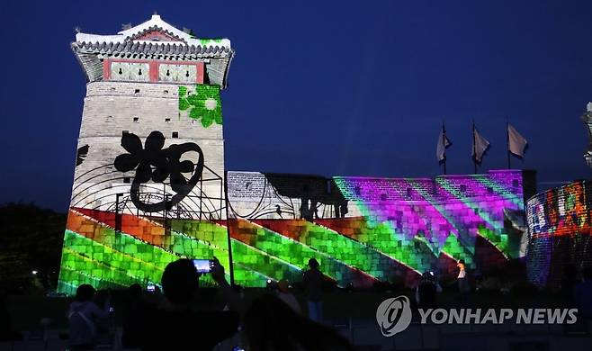 (수원=연합뉴스) 홍기원 기자 = 23일 오후 경기도 수원시 화서문에서 수원화성 미디어아트쇼 '만천명월(萬川明月): 정조의 꿈, 빛이 되다'리허설이 진행되고 있다.