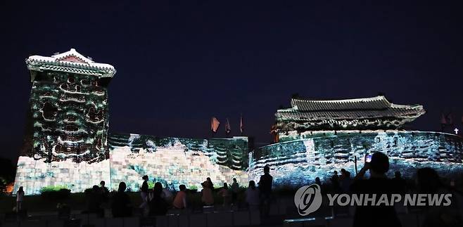 (수원=연합뉴스) 홍기원 기자 = 23일 오후 경기도 수원시 화서문에서 수원화성 미디어아트쇼 '만천명월(萬川明月): 정조의 꿈, 빛이 되다'리허설이 진행되고 있다.