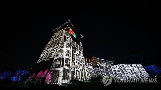 (수원=연합뉴스) 홍기원 기자 = 23일 오후 경기도 수원시 화서문에서 수원화성 미디어아트쇼 '만천명월(萬川明月): 정조의 꿈, 빛이 되다' 리허설이 진행되고 있다.
