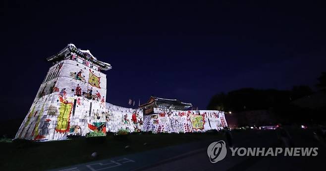 (수원=연합뉴스) 홍기원 기자 = 23일 오후 경기도 수원시 화서문에서 수원화성 미디어아트쇼 '만천명월(萬川明月): 정조의 꿈, 빛이 되다' 리허설이 진행되고 있다.