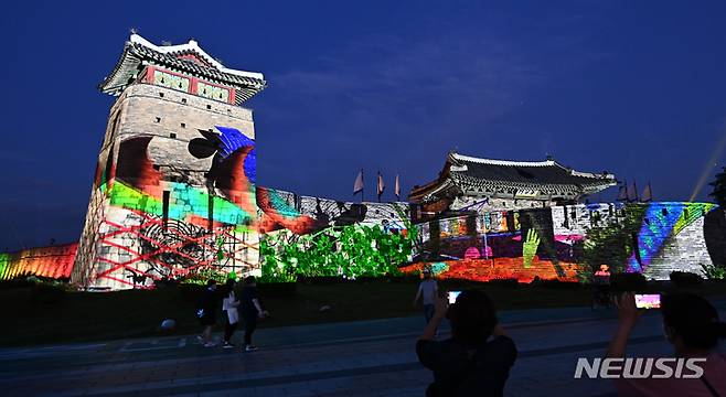 [수원=뉴시스] 김종택기자 = 23일 오후 경기도 수원시 유네스코 세계유산 수원화성 화서문에서 열린 2021 수원화성 미디어아트쇼 리허설에서 '미디어파사드&라이트쇼'가 펼쳐지고 있다. 오는 24일부터 10월24일까지 수원화성 화서문과 서북공심돈 일대에서 진행되는 미디어파사드&라이트쇼는 성벽 등 최대 220m 구간에 화려한 LED 조명을 비춰 영상을 표현한다. 2021.09.23.