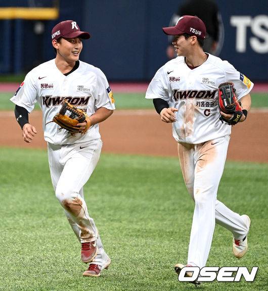 8회초 2사 1, 2루 상황 NC 알테어의 유격수 땅볼 때 2루 주자 최승민을 3루에서 포스아웃으로 잡아낸 키움 유격수 김주형(왼쪽)이 더그아웃으로 향하며 2루수 김혜성과 인사를 나누고 있다. 2021.09.23 / dreamer@osen.co.kr