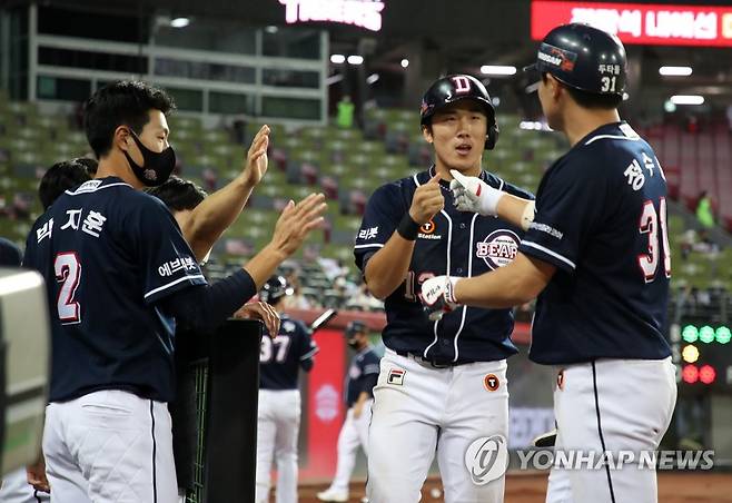 (광주=연합뉴스) 조남수 기자 = 23일 광주-기아챔피언스필드에서 열린 2021 프로야구 두산 베어스와 KIA 타이거즈 경기. 두산 8회초 1사 만루에서 희생플라이를 친 정수빈(오른쪽)과 득점을 올린 3루주자 허경민이 더그아웃 앞에서 서로를 격려하고 있다. 2021.9.23