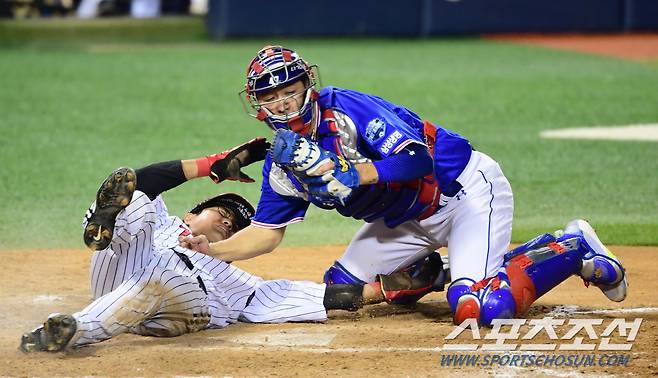 2021 KBO리그 LG트윈스와 삼성라이온즈의 경기가 23일 서울잠실야구장에서 열렸다. LG 채은성이 9회말 무사 1,2루에서 김민성 적시타때 홈에서 아웃되고 있다. 잠실 =최문영 기자 deer@sportschosun.com /2021.09.23/