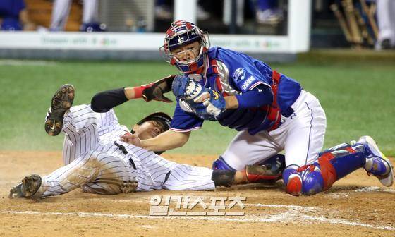 [포토]강민호, 채은성 울린 철벽수비