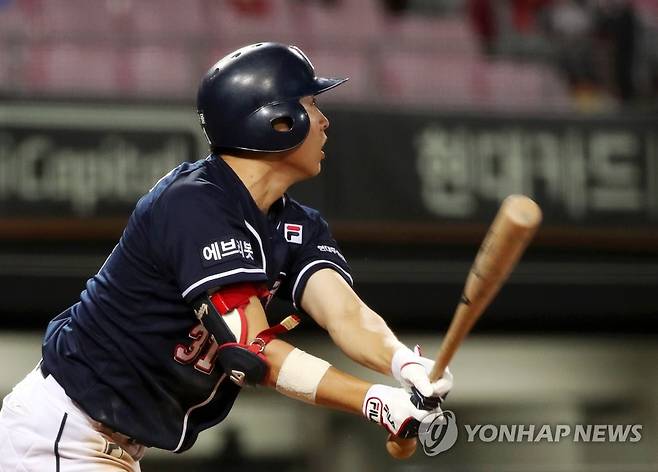 (광주=연합뉴스) 조남수 기자 = 23일 광주-기아챔피언스필드에서 열린 2021 프로야구 두산 베어스와 KIA 타이거즈의 경기에서 두산 정수빈이 8회초 1사 만루에서 1타점 희생플라이를 때리고 있다. 2021.9.23