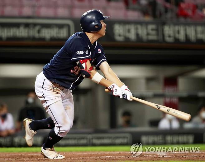 (광주=연합뉴스) 조남수 기자 = 23일 광주-기아챔피언스필드에서 열린 2021 프로야구 두산 베어스와 KIA 타이거즈의 경기에서 두산 정수빈이 8회초 1사 만루에서 1타점 희생플라이를 때리고 있다. 2021.9.23